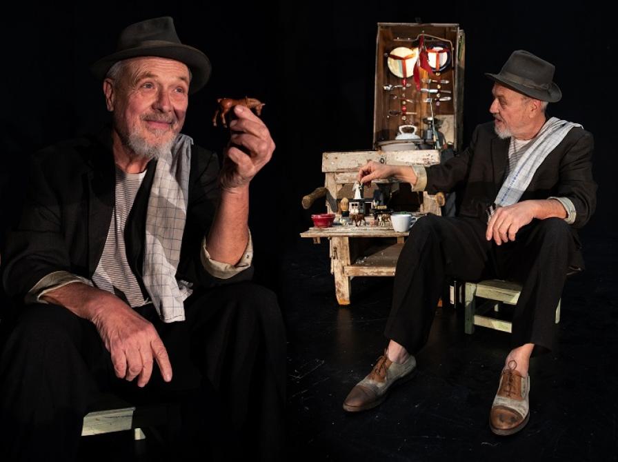 Hundested BibliotekHan ligger henslængt ved siden af bistadet med hatten ned over øjnene, når vi kommer ind. Børnene betragter ham helt tavse. Så linder han på hatten og ser på dem med ét øje. Tavst. “Vi skal se teater”, hvisker børnene – og antyder dermed, at han er ret så meget i vejen, dér midt på scenen. Han sætter sig op og skyder hatten om i nakken. Langsomt kommer han på benene. Børnene holder vejret: Han går vel? Nej, han åbner flyvebrættet til bistadet, tager vand og vaskefad frem, vasker og barberer sig langsomt, mens børnene ser på og lidt efter lidt begynder at kommentere. En monologforestilling udvikler sig til en intens dialogforestilling: